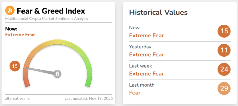 Figures show that the Crypto Fear & Greed Index plunged to readings as low as 15, levels not seen since mid-2022.