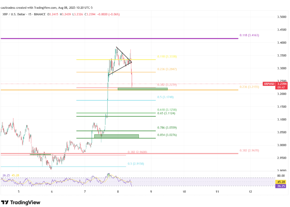 Although the long-term XRP structure is bullish, the short-term picture shows XRP is currently undergoing a pullback after touching $3.38 very briefly on August 8. Analyst CasiTrades noted that this retracement is now approaching an important support zone between $3.21 and $3.22, which also coincides with the 0.382 Fibonacci retracement level.